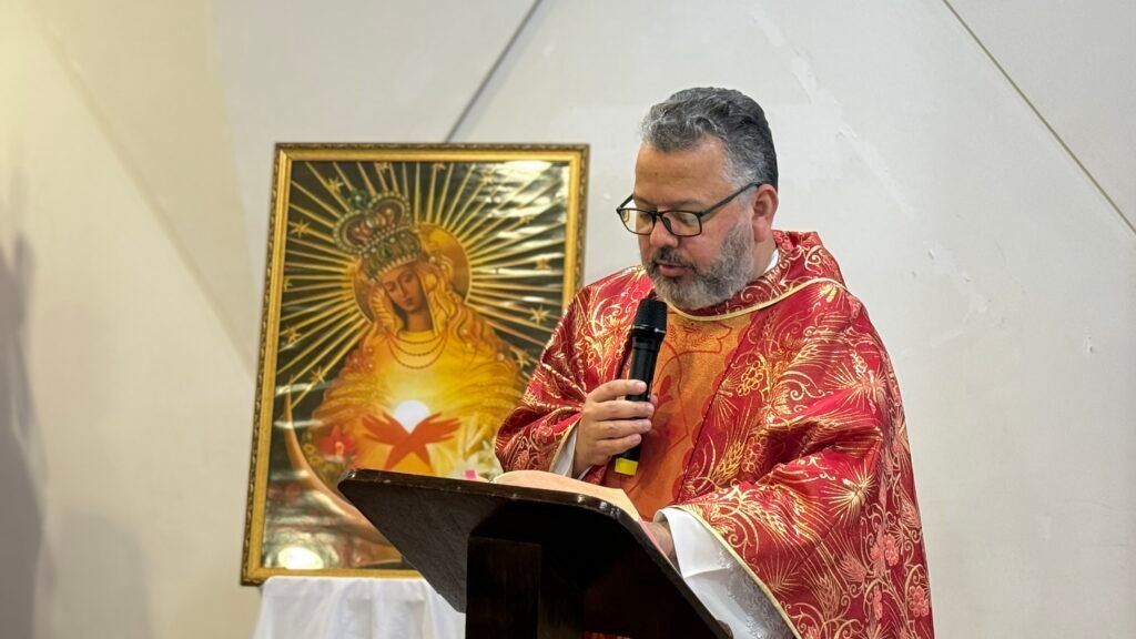 Em sua homilia, Padre Fernando refletiu sobre o Evangelho da festa da Exaltação da Santa Cruz, lembrando que aquilo que muitas vezes vemos apenas como sofrimento, em Cristo se transforma em esperança. Ele recordou que da cruz nasce o sinal mais puro do amor de Deus. Nas palavras do sacerdote, “tudo aquilo que é dor e pesado para nós, contemplando Cristo, torna-se esperança, porque do seu coração aberto brota a alegria”.