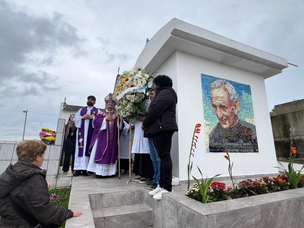 Diante do túmulo do Pe. Giuseppe Pisoni, a prece foi breve e cheia de sentido: agradecimento por uma vida doada ao povo e pedido para que seu testemunho inspire passos firmes no seguimento de Cristo.