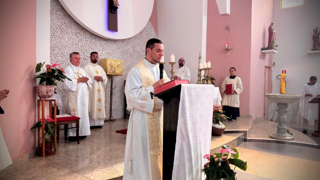 Dando sequência à liturgia, após a segunda leitura, Padre Adriano aproximou-se do altar e recebeu o Evangeliário, sinal do dever de anunciar a Palavra de Deus a todos, sem distinção. Em seguida, proclamou o Evangelho, inserindo seu ministério no centro da celebração eucarística.
