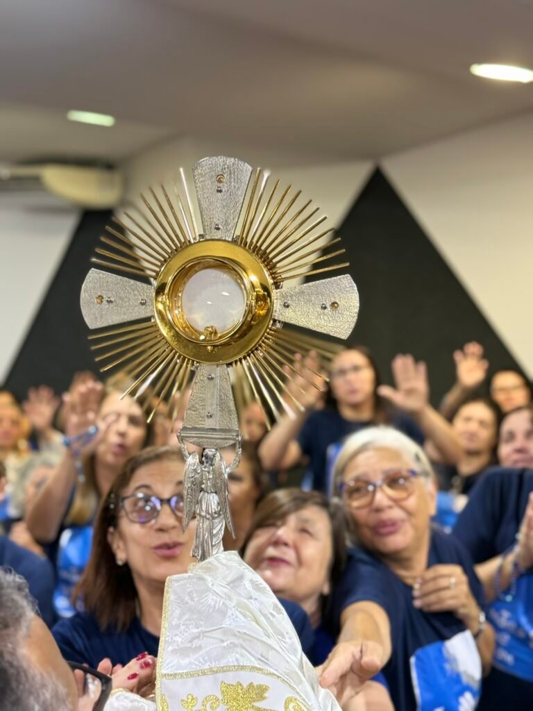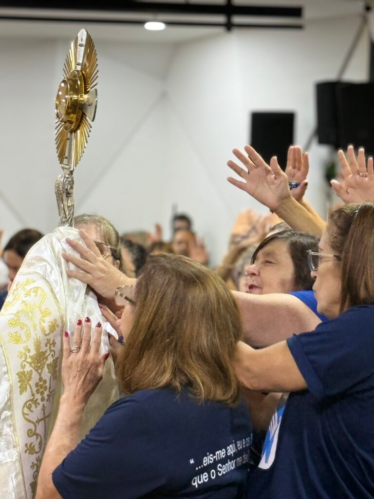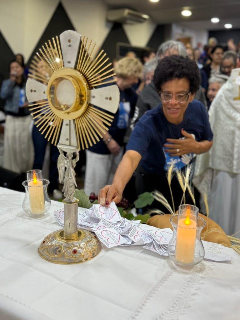 Antes da adoração, cada participante recebeu um pequeno coração de papel como sinal do que carrega por dentro. A orientação foi que as mães escrevessem nele os nomes dos filhos e também de outras pessoas confiadas à sua intercessão, aquilo que desejavam colocar aos pés de Jesus. A tarde então entrou no momento de adoração ao Santíssimo Sacramento, com cânticos e recolhimento, ponto alto do encontro em sintonia com o tema proposto.