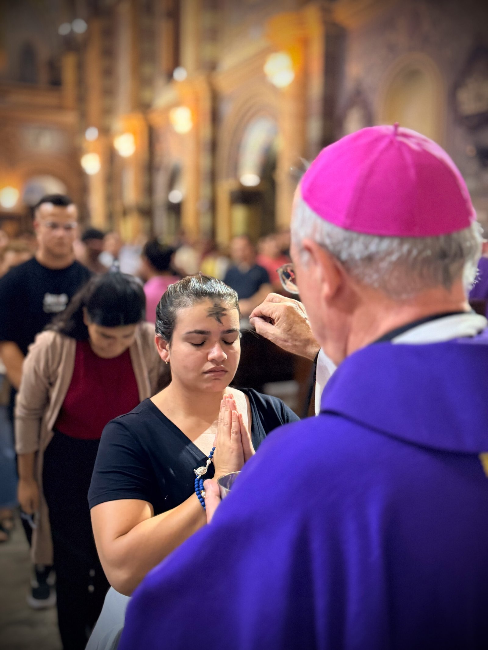 Após a homilia, a celebração chegou ao seu gesto mais característico: a bênção e imposição das cinzas. Em clima de silêncio e recolhimento, os fiéis se aproximaram para receber sobre a cabeça o sinal penitencial que abre a Quaresma e recorda, de modo muito direto, a fragilidade humana e a urgência de recomeçar. As palavras do rito conduziram a assembleia ao essencial: conversão de coração e fidelidade ao Evangelho.