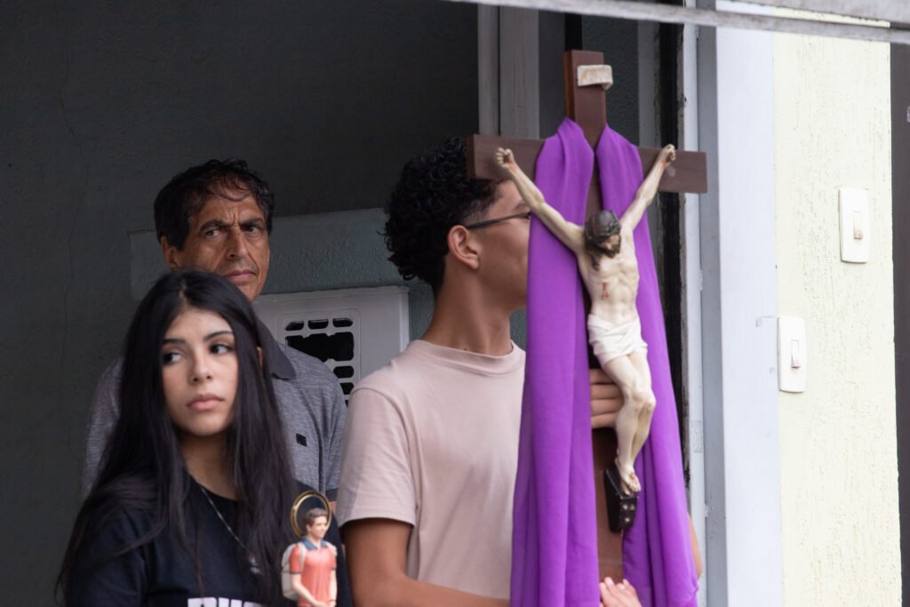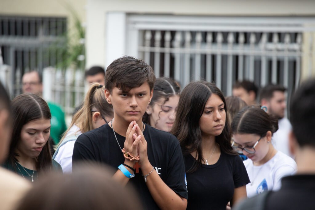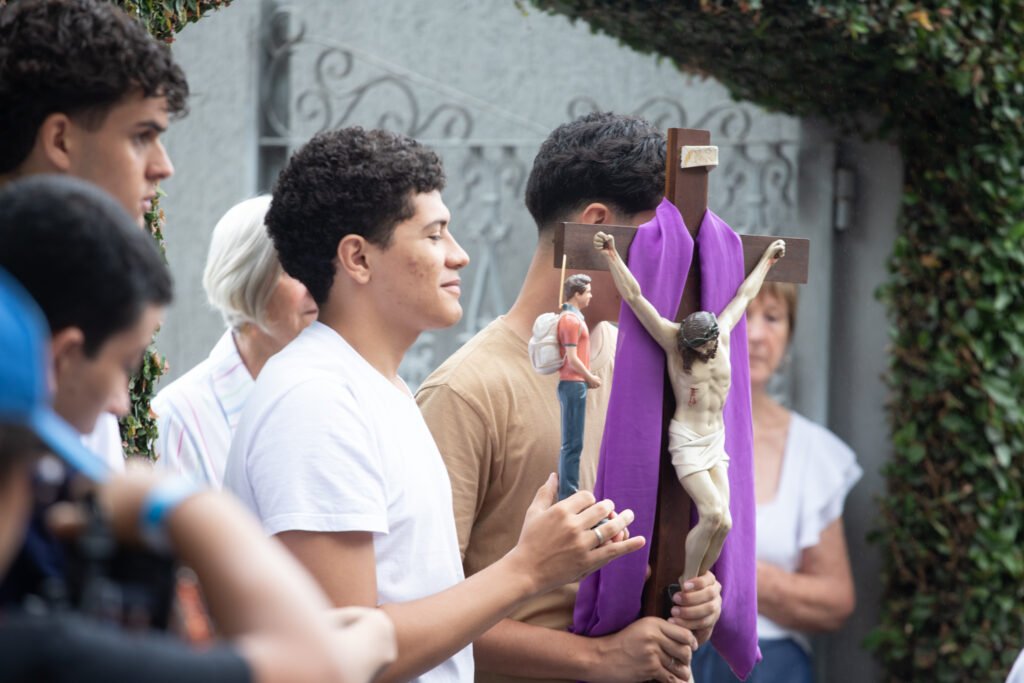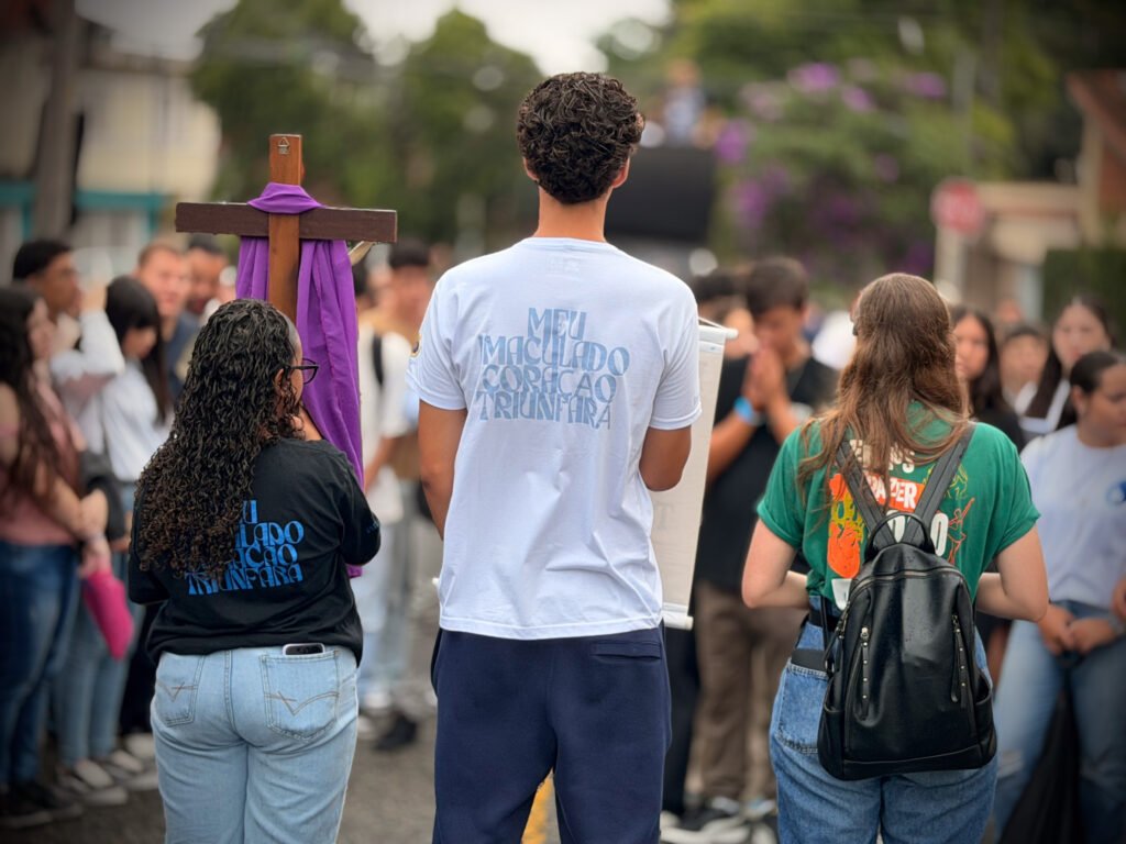 Após a celebração, a juventude foi acolhida com um café da manhã reforçado no salão paroquial, momento de convivência e organização do percurso. Em seguida, os participantes saíram caminhando pelas ruas do bairro, meditando a Via-Sacra de Jesus e entoando cantos de louvor, numa expressão pública e serena de fé, com passos ritmados pela oração, e mesmo diante da chuva, mantiveram firmes na caminhada.