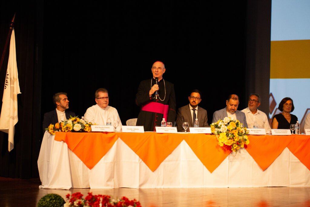 Dom Pedro também dirigiu sua palavra aos presentes e ligou a missão educativa da Igreja à origem do colégio. “Uma palavra que me vem nesse momento é de agradecimento”, afirmou. Ao recordar Monsenhor Alexandre Venâncio Arminas, destacou sua sensibilidade diante das necessidades do povo e resumiu esse gesto com uma imagem forte: “Em vez de lamentar a escuridão, acenda um fósforo. E ele acendeu e iniciou essa escola”.