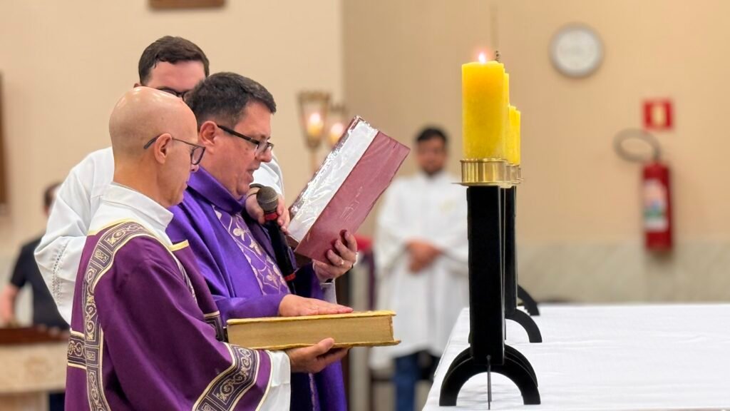 A comunidade se reuniu em um momento marcante para a vida paroquial, acompanhando de perto cada gesto do rito de posse. Após a saudação inicial, foi feita a leitura do decreto de nomeação do novo pároco. Em seguida, como prevê a disciplina da Igreja, o Padre Vanderlei professou publicamente a fé da Igreja, assumindo diante do povo a missão que lhe era confiada. Depois, no momento próprio da liturgia, recebeu das mãos do bispo o Livro dos Evangelhos, sinal do compromisso de anunciar a Palavra de Deus com fidelidade.