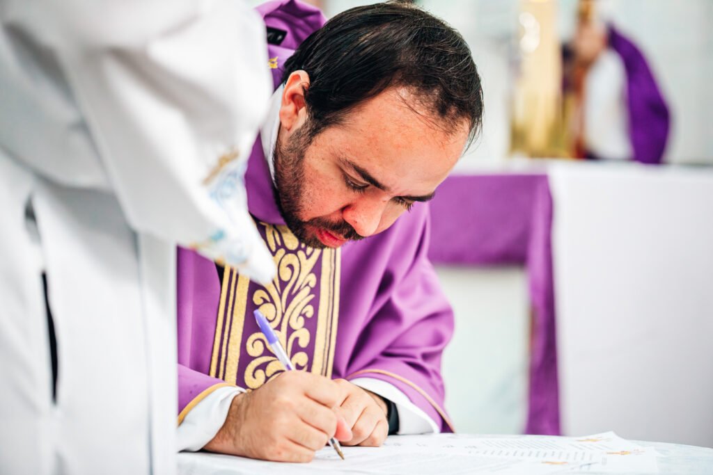 Após a apresentação do novo pastor à comunidade, foi lido o decreto de nomeação. Em seguida, Padre Marcos manifestou publicamente sua adesão à fé da Igreja e assumiu, diante do bispo e do povo de Deus, o compromisso de exercer com fidelidade o ministério que lhe era confiado. Ao longo da celebração, também recebeu os sinais próprios da missão paroquial, que recordam seu chamado a anunciar a Palavra, celebrar os sacramentos, cuidar da casa de Deus e conduzir pastoralmente a comunidade.