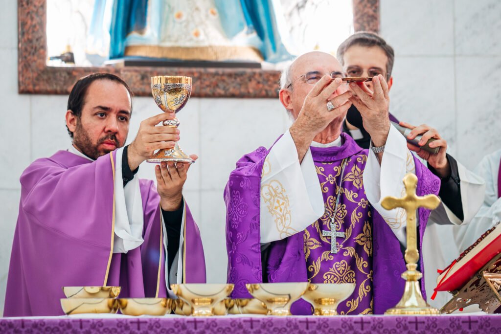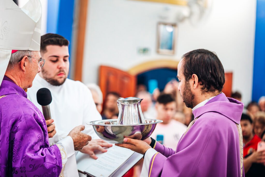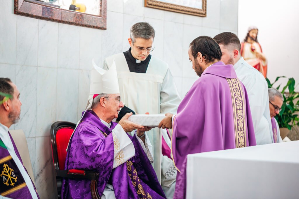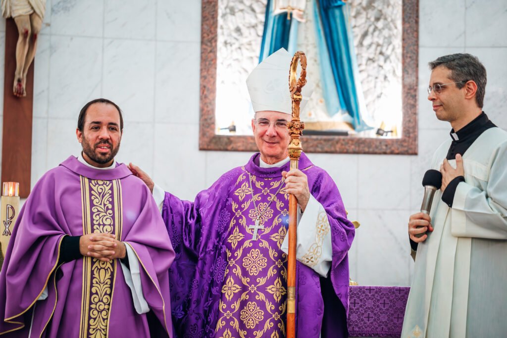 Depois da homilia, o rito da posse prosseguiu com a renovação dos compromissos sacerdotais diante do bispo e da assembleia. Em seguida, Padre Marcos recebeu os símbolos ligados ao cuidado pastoral da paróquia, assumindo oficialmente a missão de presidir, santificar e servir aquela porção do povo de Deus confiada à sua responsabilidade.