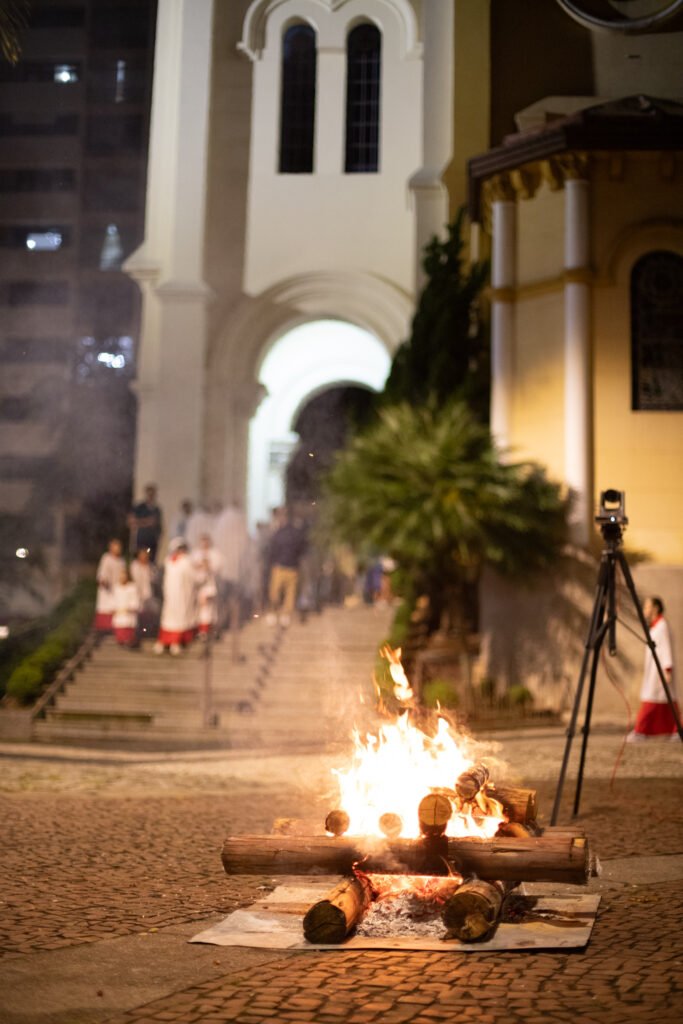 Foi ali também que o Círio Pascal foi preparado. Sobre ele, foram traçados a cruz, as letras Alfa e Ômega e os números do ano, recordando que Cristo é o princípio e o fim, Senhor do tempo e da história. Em seguida, foram colocados os cravos, que recordam as chagas gloriosas do Senhor. Acendido no fogo novo, o círio passou a resplandecer como sinal do Cristo Ressuscitado, cuja luz dissipa as trevas do coração humano.