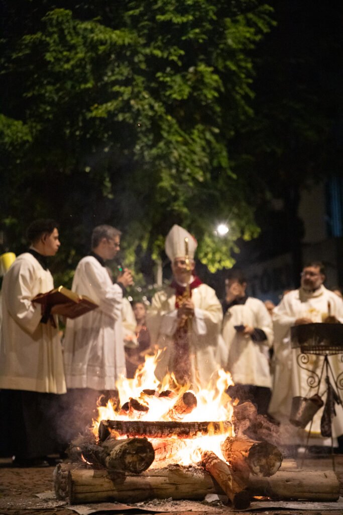 No Sábado Santo, 4 de abril, Dom Pedro Carlos Cipollini, presidiu o terceiro dia do Tríduo Pascal, a Vigília Pascal, ao lado do Padre Jean Rafael de Barros e do diácono João Ribeiro, reunindo numerosos fiéis para aquela que a Igreja reconhece como a mãe de todas as vigílias. A celebração começou na Praça do Carmo, diante da fogueira preparada para a bênção do fogo novo, sinal da Luz de Cristo que vence as trevas do pecado e da morte.