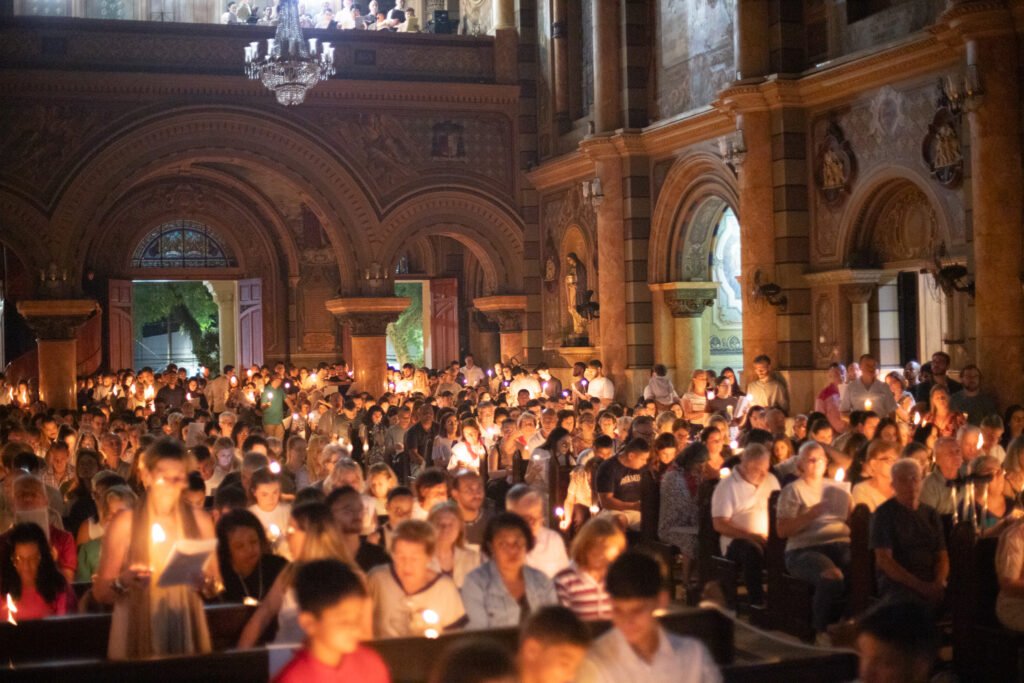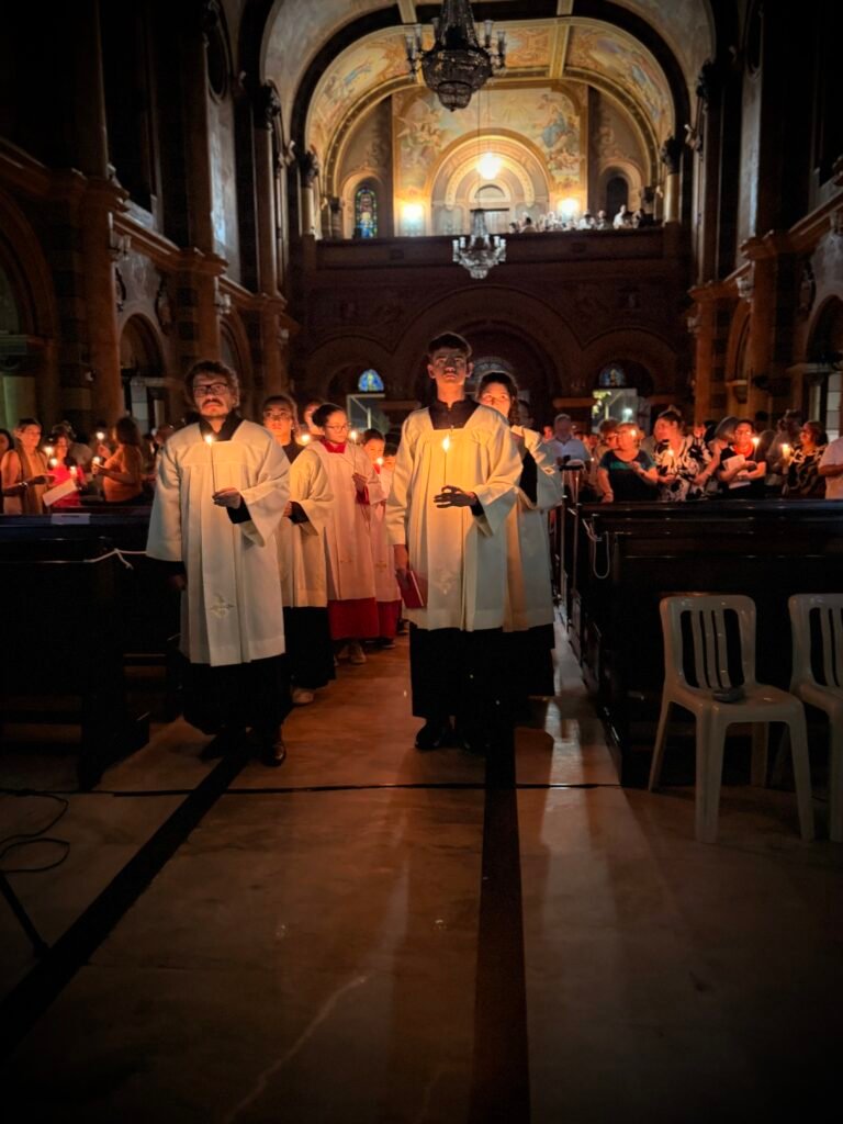 Depois, já com o povo reunido no interior da igreja, teve início a procissão de entrada. Por três vezes, o círio foi elevado com a aclamação Eis a luz de Cristo, à qual a assembleia respondeu “Demos graças a Deus“. A cada parada, as velas foram sendo acesas a partir da chama do círio, até que a Catedral, antes mergulhada na escuridão, foi pouco a pouco se iluminando. Era a imagem da Páscoa sendo anunciada não apenas com palavras, mas com a própria força dos sinais.