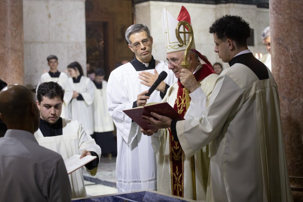 Em seguida, foi cantado o Exsultet, a grande Proclamação da Páscoa. Mais do que um canto solene, ele anuncia a vitória de Cristo sobre a morte e convida o céu, a terra e toda a Igreja a entrarem na alegria desta noite. Ao cantar a felicidade da noite em que Cristo ressurgiu e ao exaltar o círio que acendeu as velas do povo, a Igreja proclama que a Páscoa não é apenas lembrança, mas presença viva da redenção que ilumina novamente a humanidade.