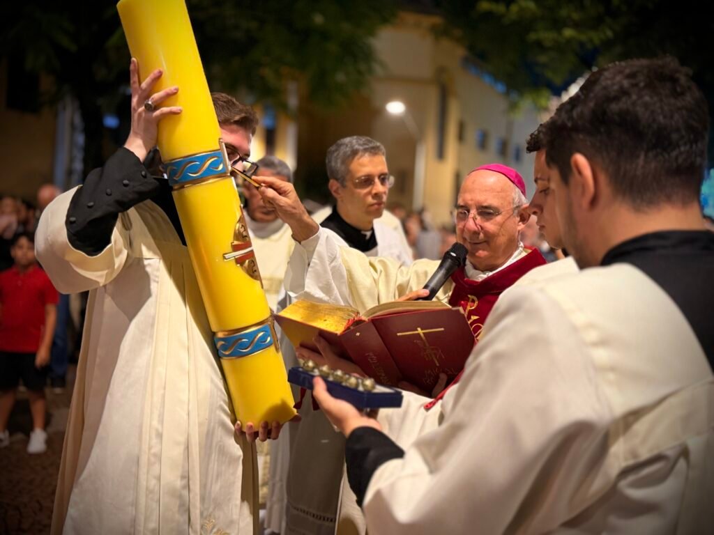 Ao aprofundar o sentido dos símbolos da Vigília, o bispo explicou a primeira parte da celebração, vivida na escuridão e iluminada pela chama do círio. Segundo ele, aquele início recorda a humanidade que aguardava a salvação. “Na escuridão dos tempos antigos, a luz da esperança brilhava na esperança de que Deus redimiria a humanidade, enviando o Messias, o Salvador”, afirmou. E completou dizendo que o próprio Filho de Deus veio ensinar “o caminho da felicidade, que é o caminho do amor”, um amor que se mostra como serviço, doação de vida e vitória do bem sobre o mal.